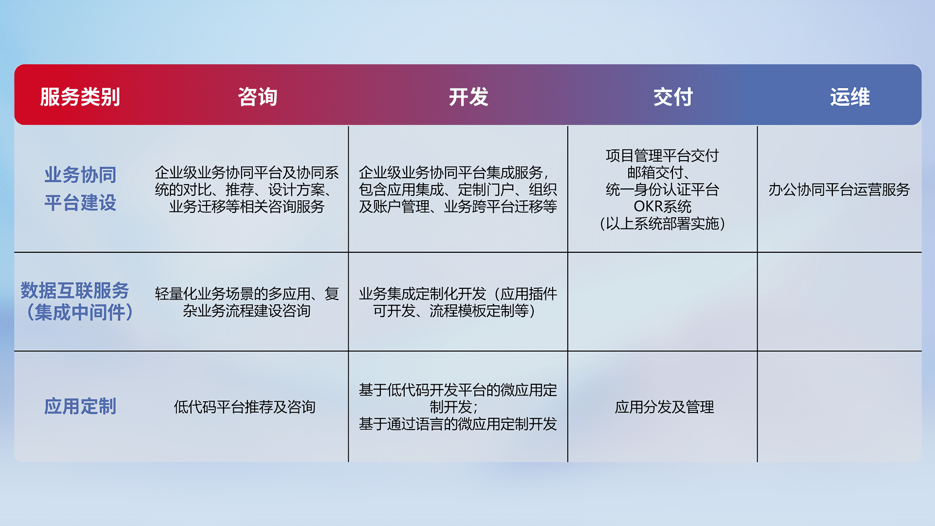针对钉钉、、企微、、IDaas等平台级产品提供产品的规划、、、、方案、、交付、、、定制化开发等服务,,,,实现如统一协同办公、、、智能客户服务、、混合会议管理、、、、智能数据查询、、、等业务场景,,,,实现数字化转型。。。